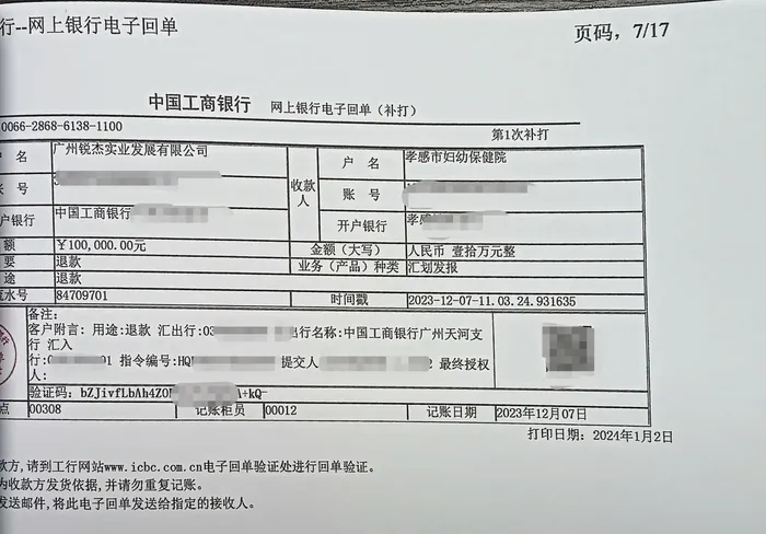 鄭某傑向記者提供的幾份銀行匯款流水顯示,在2023年12月7日,鋭傑公司分三次向孝感婦幼保健院賬户匯入共計28.149萬元,用途備註為“退款”,2023年12月8日,孝感婦幼保健院向鋭傑公司賬户匯入28.149萬元,備註為“設備款”。因此鄭某傑認為,孝感婦幼保健院在此後以“專項資金未下撥為由拒絕支付”的説法無法成立。“當初我們在簽署購銷合同時,對方也沒有稱支付需要‘專項資金’這個前提條件,而且這個時間成本也不應該由我們來承擔。”