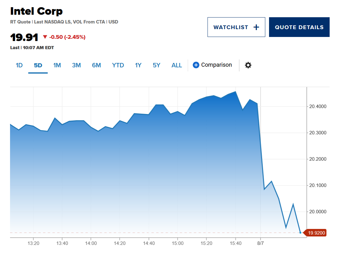 據美國消費者新聞與商業頻道(CNBC)、路透社報道,8月7日,美國總統特朗普在其社交媒體平台“真實社交”稱,英特爾首席執行官陳立武應立即辭職。隨後,英特爾股價盤前一度大跌超5%。截至發稿,跌約3%。