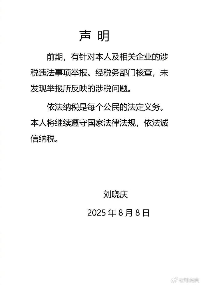 同日,演員劉曉慶也在社交平台發佈聲明回應稱:“前期,有針對本人及相關企業的涉税違法事項舉報。經税務部門核查,未發現舉報所反映的涉税問題。依法納税是每個公民的法定義務。本人將繼續遵守國家法律法規,依法誠信納税。”