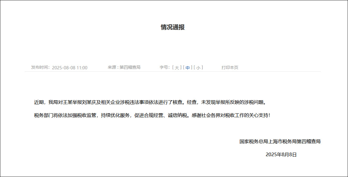 近期,我局對王某舉報劉某慶及相關企業涉税違法事項依法進行了核查。經查,未發現舉報所反映的涉税問題。