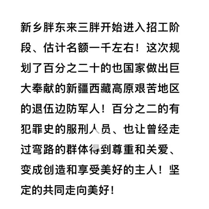 8月8日,胖東來創始人於東來在社交平台發佈消息稱,新鄉胖東來三胖開始進入招工階段,估計名額1000人左右,這次規劃了20%的崗位給退伍邊防軍人。值得注意的是,其中還規劃了2%的崗位給有犯罪史的服刑人員。