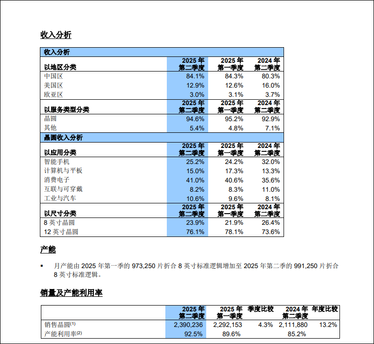 產能利用率方面,第二季度為92.5%,環比今年一季度提升0.9個百分點;第二季度月產能由2025年第一季度的97萬片摺合8英寸標準邏輯,增加至約99萬片摺合8英寸標準邏輯;第二季度摺合8英寸標準邏輯的晶圓銷售量環比提升4.3%。