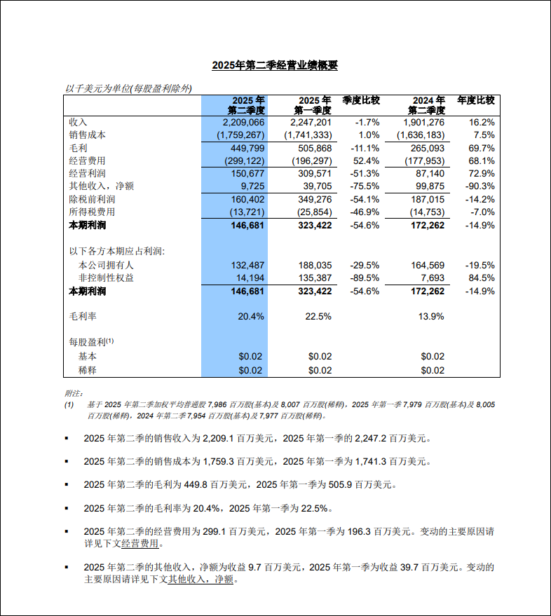 前一天晚間,中芯國際發佈2025年第二季度財報,公司整體實現銷售收入22.09億美元,同比增長16.2%,環比下降1.7%;歸母淨利潤方面,第二季度中芯國際實現1.32億美元,同比下降19.5%,環比下降29.5%。毛利率為20.4%,環比下降2.1個百分點。產能利用率92.5%,環比增長了2.9個百分點。