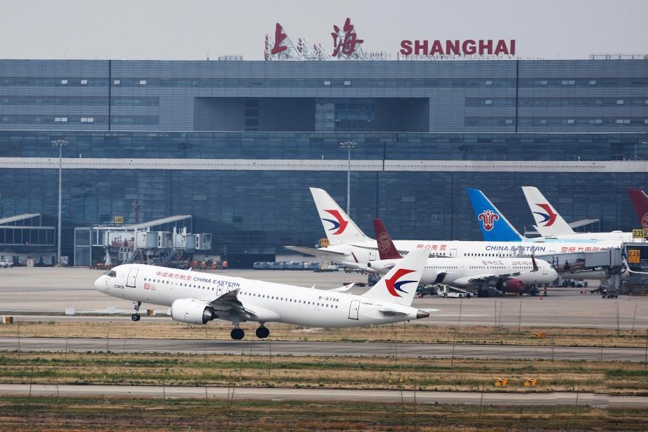 一架東方航空C919客機正從上海虹橋機場起飛。中新社