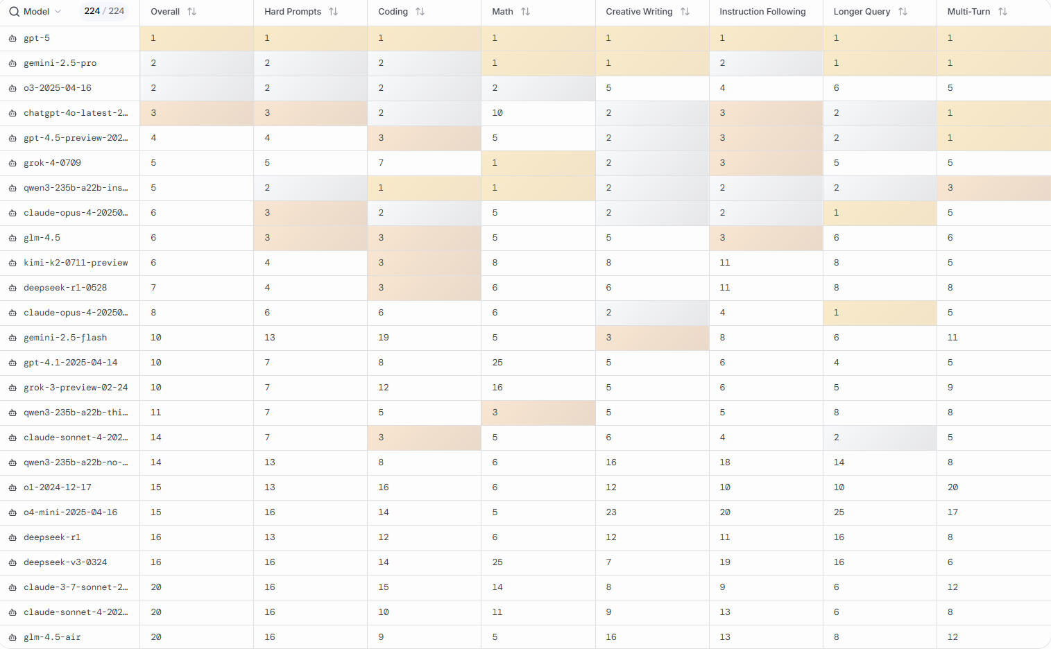 大模型競技場LM Arena的評分也已經出爐,GPT-5橫掃所有單項的第一名。