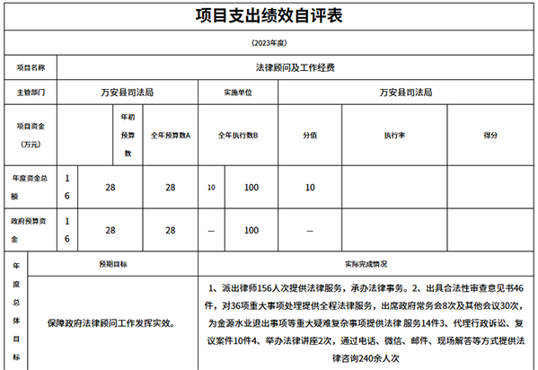 萬安縣司法局2023年度部門決算:“法律顧問及工作經費”項目支出績效自評表 萬安縣人民政府
