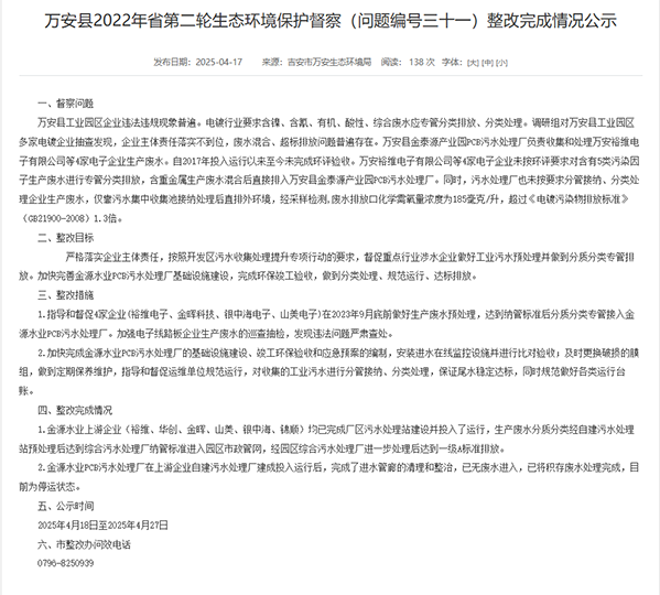 今年4月17日,吉安市萬安生態環境局發佈的整改公示顯示,此前江西省第二輪生態環境保護督察(2022年4月15日-5月10日)發現,萬安縣工業園區多家電鍍企業存在廢水混合、超標排放問題,未按要求對含5類污染因子的生產廢水專管分類排放,含重金屬廢水直接排入金泰源產業園PCB污水處理廠;而該污水處理廠也未按要求分管接納、分類處理,僅靠污水集中收集池接納處理後直排外環境,經採樣檢測,廢水排放口化學需氧量濃度為185毫克/升,超過《電鍍污染物排放標準》(GB21900-2008)1.3倍。