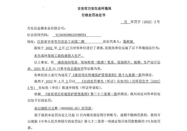 巧合的是,2022年5月18日(省環保督察之後幾天),萬安生態環境局公佈了《萬安縣金源水業有限公司-行政處罰決定書》,稱當年2月17日(省環保督察之前),生態環境局對該工業區進行了調查,調查後認為萬安縣金源水業有限公司存在未完成環保竣工驗收就投入生產的違法行為,並對其處以了80萬元的行政罰款。