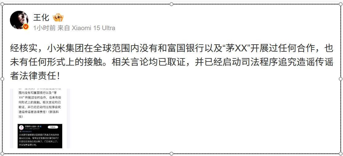 針對網傳“雷軍通過富國銀行茅XX向海外轉出50億美金”的消息,8月8日,小米公關部總經理王化發文澄清:“經核實,小米集團在全球範圍內沒有和富國銀行以及‘茅XX’開展過任何合作,也未有任何形式上的接觸。相關言論均已取證,並已經啓動司法程序追究造謠傳謠者法律責任!”