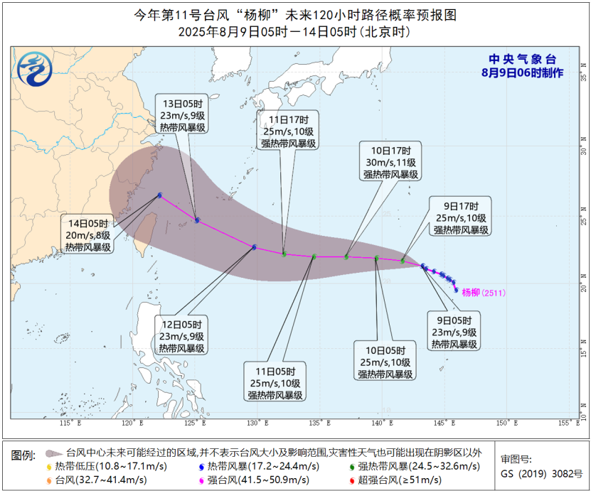 據中央氣象台消息:今年第11號颱風“楊柳”(熱帶風暴級)的中心今天(9日)早晨5點鐘位於美國關島北偏西方大約890公里的西北太平洋洋麪上,就是北緯21.3度、東經143.2度,中心附近最大風力9級(23米/秒),中心最低氣壓992百帕,七級風圈半徑為120~220公里。