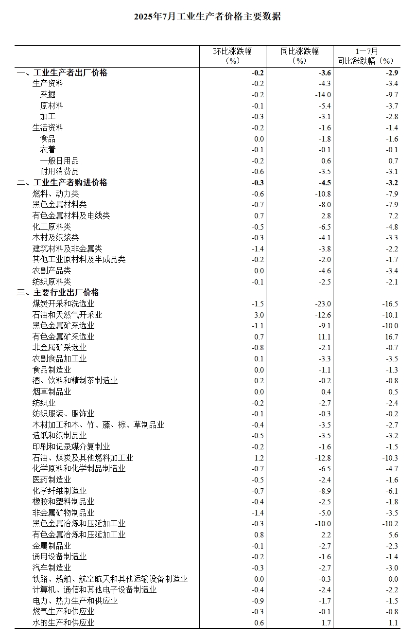 同日,國家統計局還發布了我國2025年7月的PPI數據。