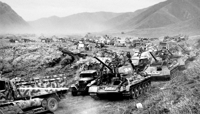 百萬蘇軍從蒙古南部邊界二連浩特到濱海地區波謝特港,同時開始對日軍全線進攻。西面一路已佔滿洲里,東北一路從伯力分渡黑龍江及烏蘇里江佔領城市數處,東面一路亦佔數城。