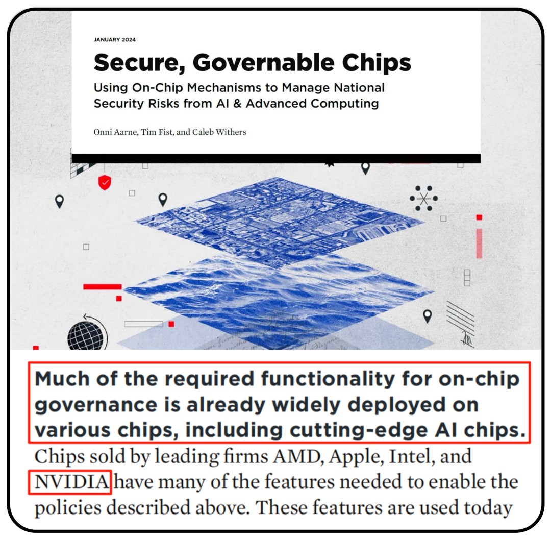 新美國安全中心報告《安全、可管控的芯片——使用片上治理機制來管理人工智能和高級計算的國家安全風險》,報告中提到,片上治理所需的許多功能已在各類芯片上廣泛部署,包括尖端的人工智能芯片。AMD、蘋果、英特爾和英偉達等領先企業銷售的芯片就具備上述諸多政策所需的功能。