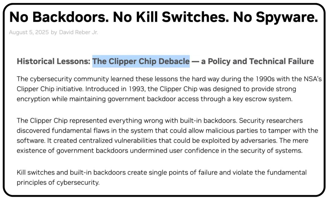 英偉達在隨後的自辯聲明中提到,芯片沒有“後門”,他們還專門提到了“Clipper芯片”事件。