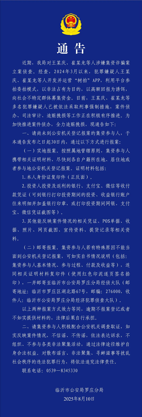 近期,我局對王某慶、崔某龍等人涉嫌集資詐騙案立案偵查。經查,2024年3月以來,犯罪嫌疑人王某慶、崔某龍等人開發並運營“樹拍”APP,利用平台參拍委拍模式,以非法佔有為目的,以高額回報為誘餌,向社會不特定羣體募集資金。目前,王某慶、崔某龍等多名犯罪嫌疑人已被依法採取刑事強制措施,案件偵辦、司法審計、追贓挽損等工作正在積極有序推進。為加快推進案件偵辦,全力追贓挽損,現通告如下: