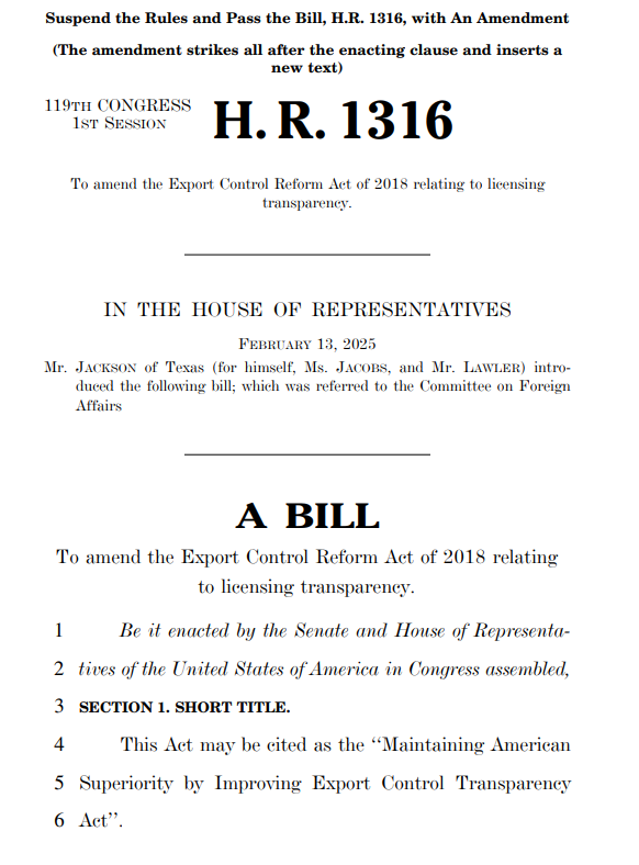 在7月27日之前,美國白宮的總統案頭,就擺放着這樣一份可能深刻影響未來全球技術格局的法案——H.R. 1316,即《通過提高出口管制透明度維護美國優勢法案》。在走完國會山的所有立法程序後,被正式呈送至白宮,等待總統的最終簽署。美國正試圖將過去數年間一系列零散、臨時的行政管制措施,整合、固化為一套長期、透明且更具威懾力的法律框架。