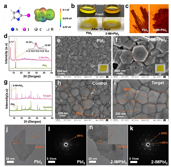 針對這一挑戰,昆明理工大學材料科學與工程學院陳江照教授團隊與冶金與能源學院黃惠教授團隊合作,提出了創新解決方案。他們通過在鈣鈦礦前驅液中引入一種含碘的有機分子,使其與殘留碘化鉛原位反應,形成具有六邊形層狀結構的穩定化合物。這種化合物不僅能有效鈍化晶界缺陷,還能抑制離子遷移和相分離,顯著提升電池的電荷傳輸能力。