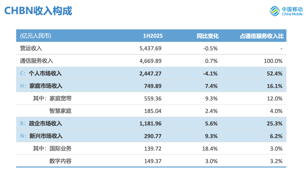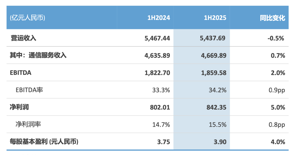 當天,中國移動披露2025年半年報,上半年實現營收5437.69億元,同比減少0.5%,其中主營業務(通信服務)收入為4669.89億元,比上年同期增長0.7%,股東應占利潤為842.35億元,同比增長5%,品牌價值達到413億美元,同比增長33.1%。