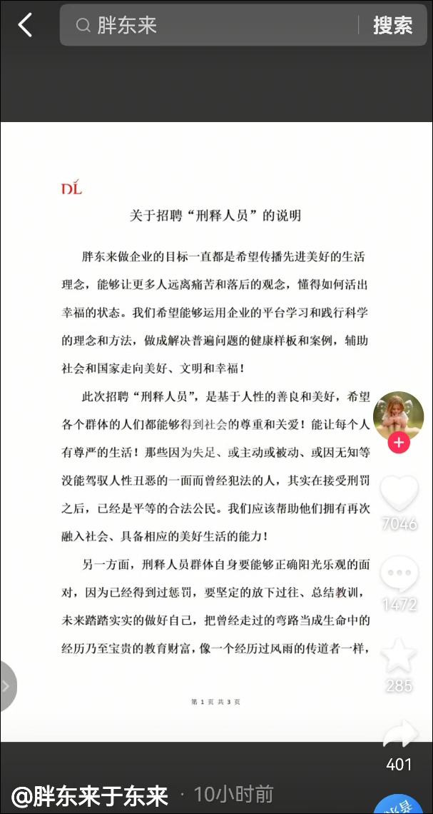 近日,胖東來擬招聘刑釋人員一事引發熱議。8月10日,胖東來創始人於東來在短視頻平台發佈關於招聘“刑釋人員”的説明。