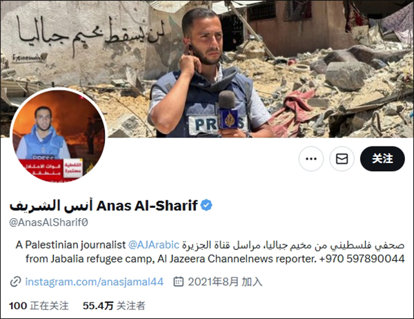 謝里夫的社交平台主頁截圖,稱自己是來自賈巴利亞難民營的巴勒斯坦記者、半島電視台記者。