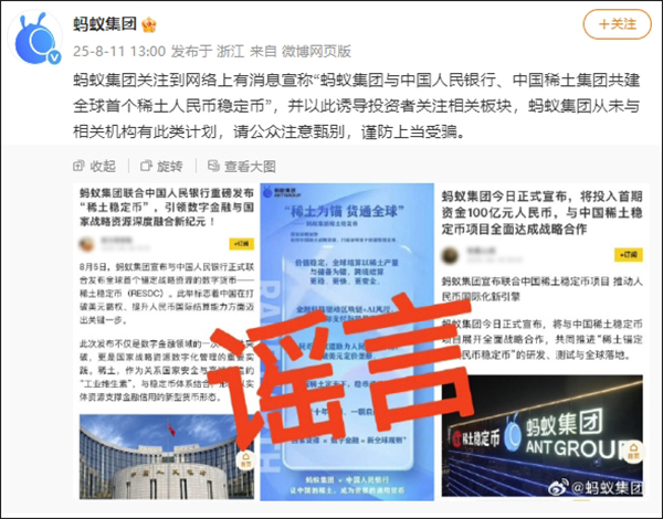 與央行、中國稀土集團共建全球首個稀土人民幣穩定幣?螞蟻集團闢謠