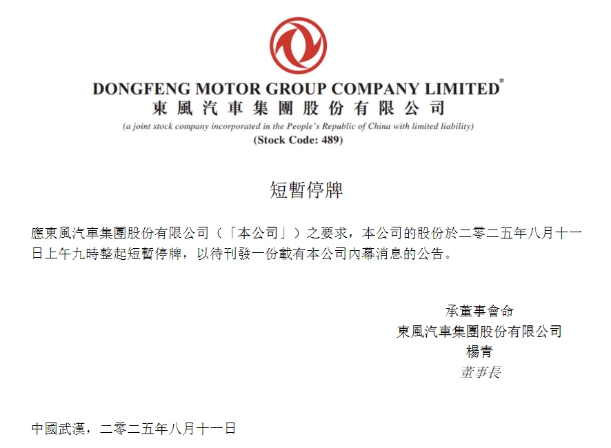 截至8月11日港股收盤,東風集團股份仍處於停牌狀態,其預告的內幕消息也尚未發佈。
