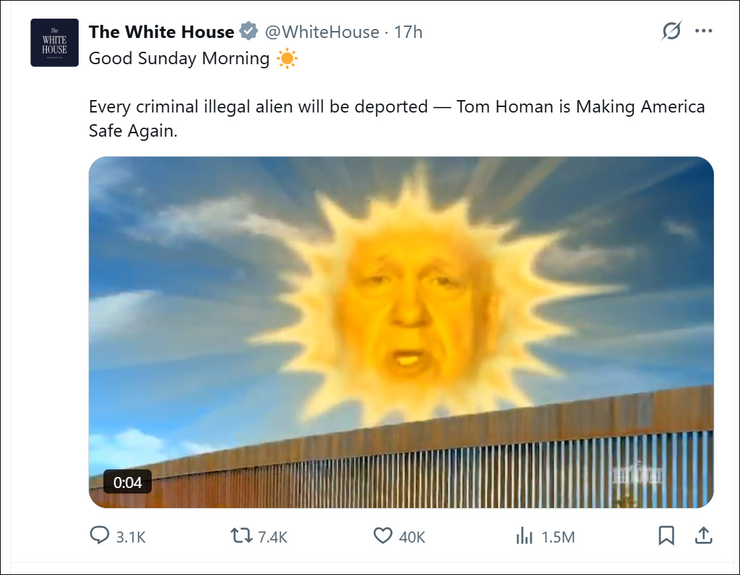 當地時間8月10日早晨,美國白宮在社交媒體平台‘X’的官方賬號發佈了一則“早安”視頻。視頻疑似借用了《天線寶寶》的畫面,而其標誌性的太陽中的嬰兒臉被替換成了美國白宮邊境事務主管湯姆·霍曼。美國白宮還配文稱,“星期天早上好。所有非法移民都將被驅逐出境——湯姆·霍曼正在讓美國再次安全。”