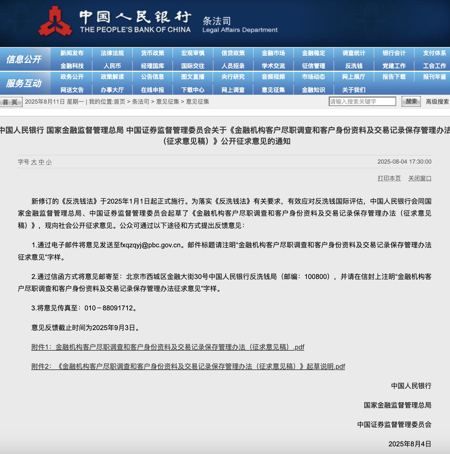 近日,中國人民銀行、國家金融監督管理總局、中國證監會聯合發佈《金融機構客户盡職調查和客户身份資料及交易記錄保存管理辦法(徵求意見稿)》,向社會公開徵求意見,截止日期為2025年9月3日。