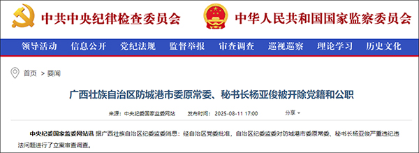 據中央紀委國家監委網站8月11日消息,據廣西壯族自治區紀委監委消息:經自治區黨委批准,自治區紀委監委對防城港市委原常委、秘書長楊亞俊嚴重違紀違法問題進行了立案審查調查。