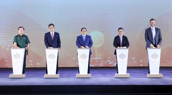 越南總理範明政(中)與特朗普次子、特朗普集團執行副總裁埃裏克·特朗普(右)及代表們出席奠基儀式。 IC photo