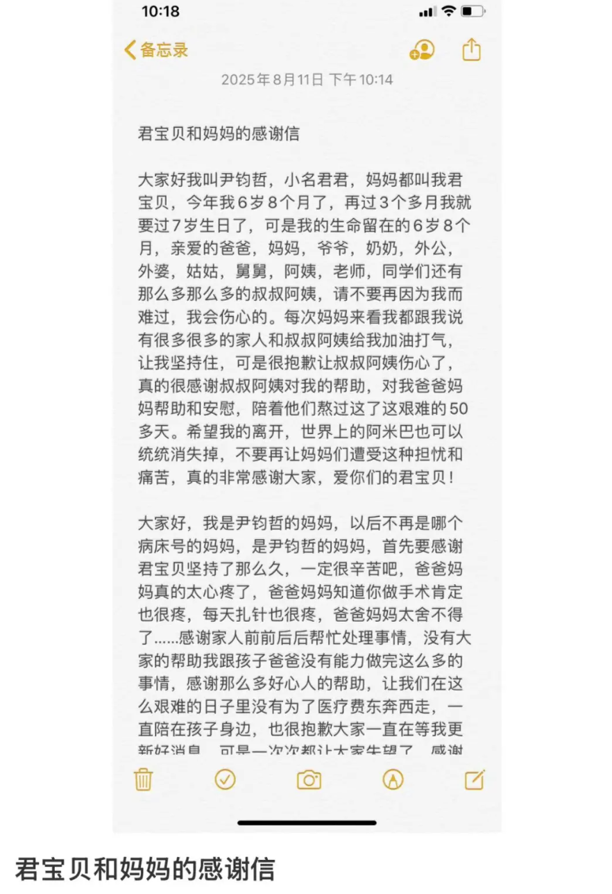 8月11日晚,男孩的媽媽在社交平台發佈了一封“君寶貝和媽媽的感謝信”。感謝信稱,男孩的生命留在了6歲8個月。