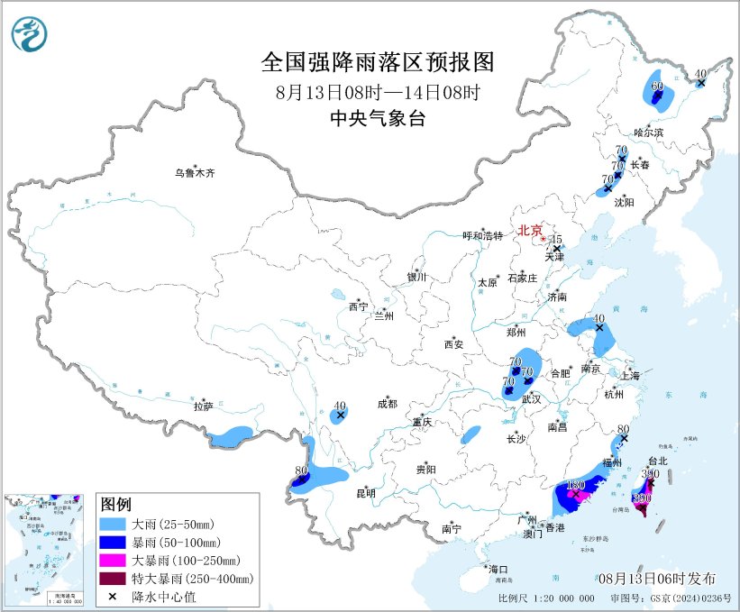 預計,8月13日08時至14日08時,黑龍江中部、吉林西部、遼寧西部、河南南部、湖北中部、江蘇北部、雲南西部、廣東東部、福建東部和南部、西藏南部、台灣島大部等地部分地區有大到暴雨,其中,福建東南部、廣東東南部、台灣島東部和南部等地部分地區有大暴雨,台灣島東部和南部等地局地特大暴雨(250~390毫米)。上述部分地區伴有短時強降水(最大小時降雨量20~50毫米,局地可超過70毫米),局地有雷暴大風等強對流天氣。