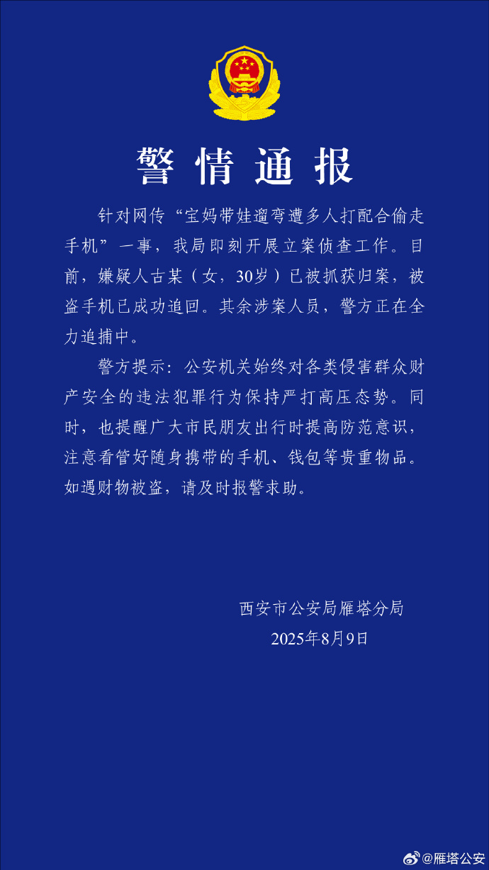 8月9日,@雁塔公安 發佈警情通報稱,嫌疑人古某(女,30歲)已被抓獲歸案,被盜手機已成功追回。其餘涉案人員,警方正在全力追捕中。