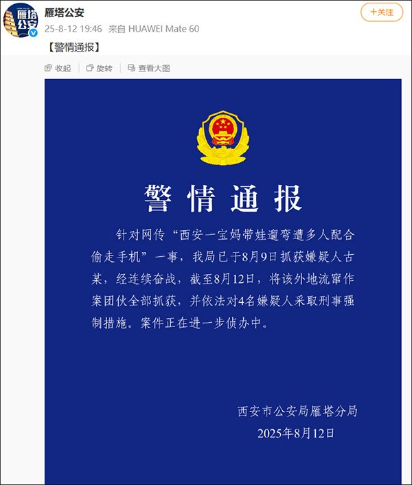 陝西西安市公安局雁塔分局官方微博@雁塔公安 8月12日發佈警情通報稱,針對網傳“西安一寶媽帶娃遛彎遭多人配合偷走手機”一事,該局已於8月9日抓獲嫌疑人古某。經連續奮戰,截至8月12日,將該外地流竄作案團伙全部抓獲,並依法對4名嫌疑人採取刑事強制措施。案件正在進一步偵辦中。