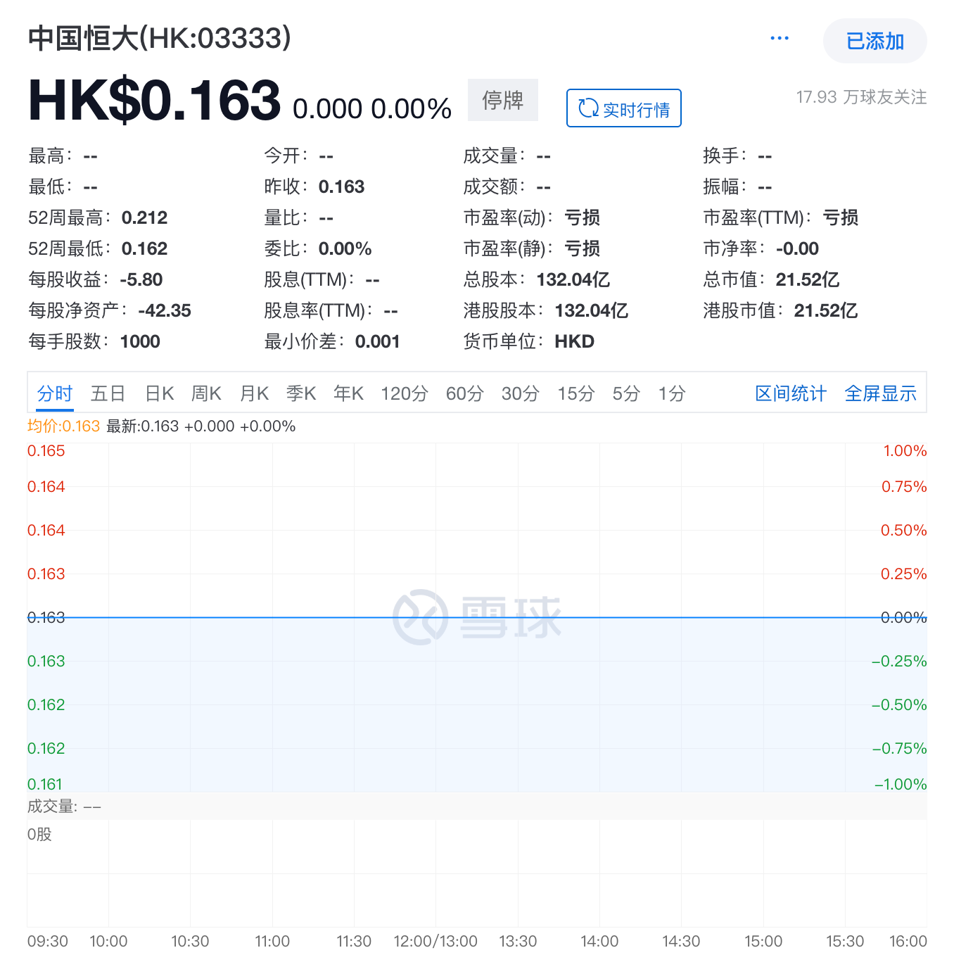 截至停牌前,中國恒大已經淪為“仙股”,報0.163港元/股,總市值僅為21.52億港元。