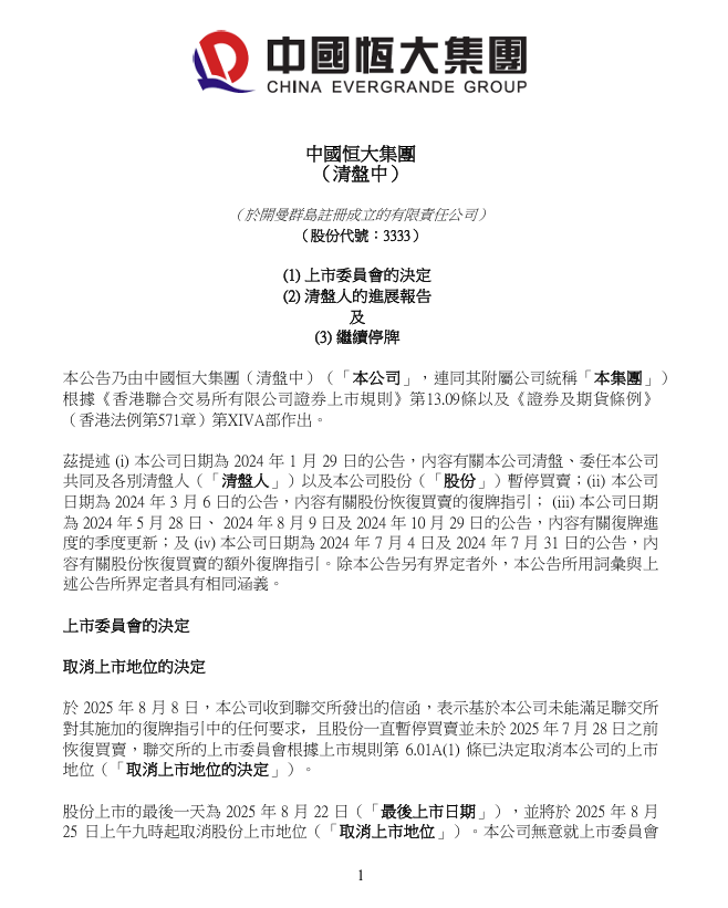 8月12日晚間,中國恒大(股票代碼:03333.HK)(清盤中)突然發佈公告稱,公司將在8月25日從港交所退市。