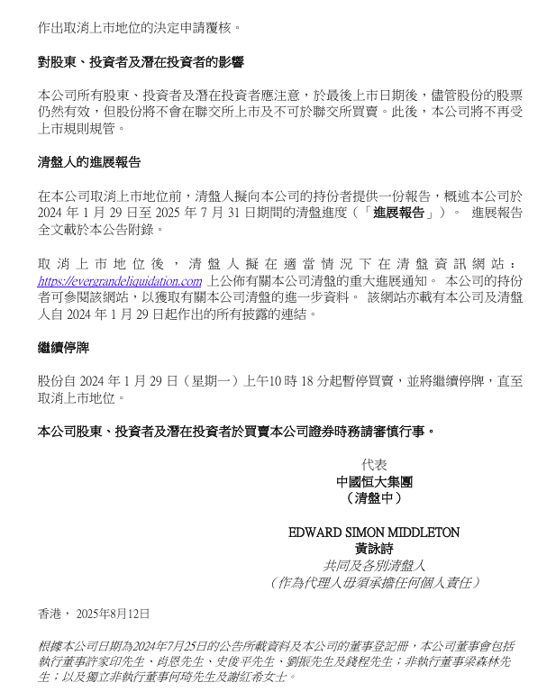 對於清盤進展情況,在中國恒大取消上市地位前,清盤人擬向公司的持有者提供一份報告,概述公司在2024年1月29日至2025年7月31日期間的清盤進度。