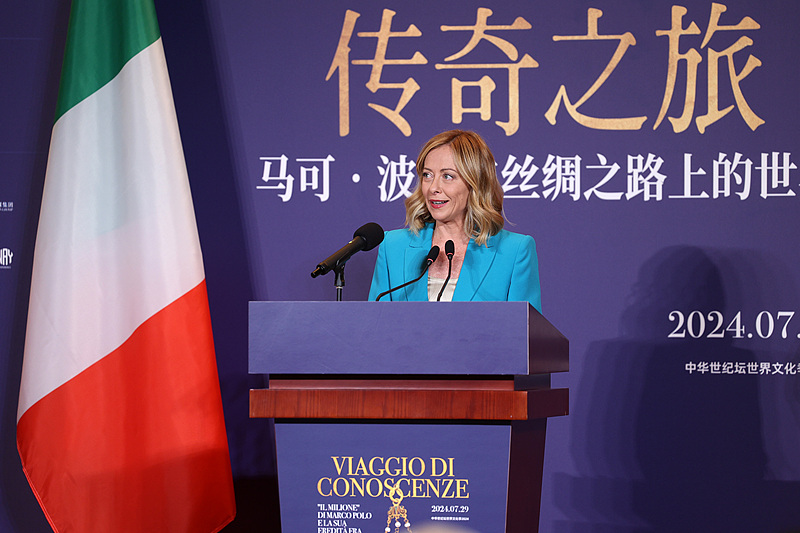 2024年7月29日,中國北京,“傳奇之旅:馬可·波羅與絲綢之路上的世界”展覽開幕,意大利總理梅洛尼出席開幕式並致辭。 視覺中國