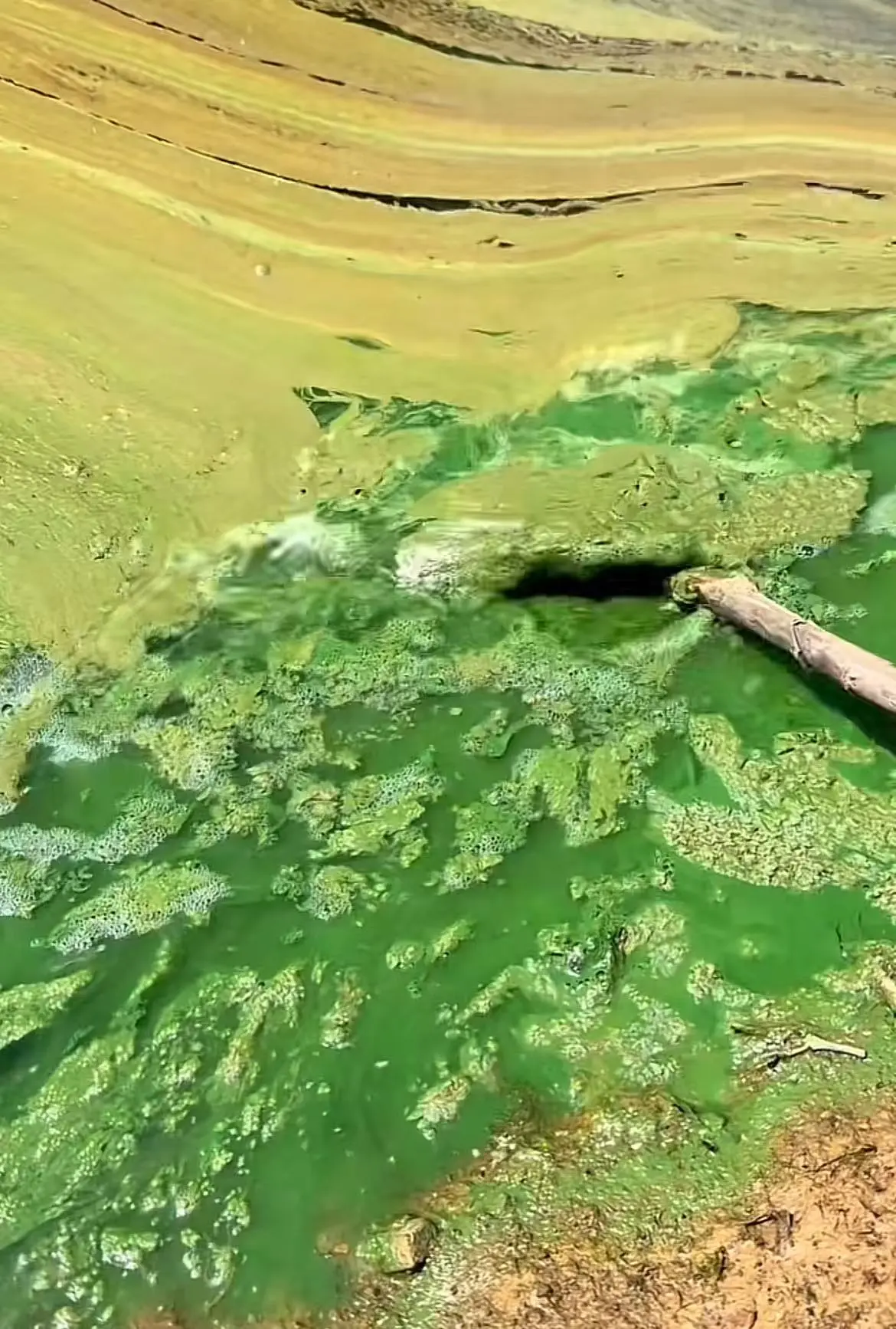 此前有視頻博主發視頻稱,宜春高安市太陽鎮長嶺水庫水污染嚴重。視頻中,長嶺水庫邊有一家養牛場,黃牛平時在水庫裏活動。水庫水體呈深綠色,岸邊的水面上飄着水華,用木棍撥開,水裏都是綠色的絲狀物。博主擔心污染可能影響周邊居民日常用水。