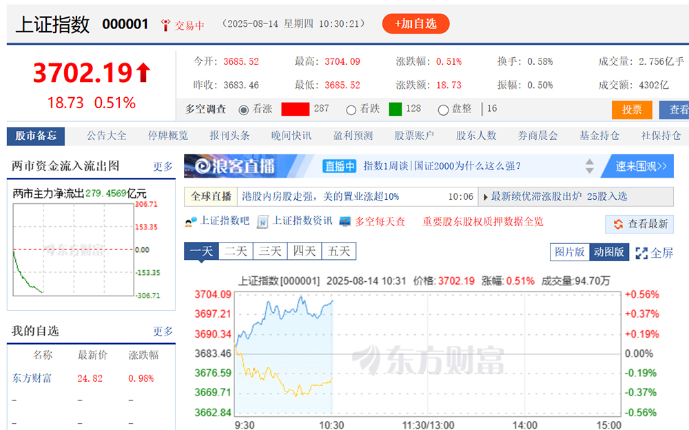 8月14日,上證指數高開,盤中突破3700點,再創近四年新高。截至10時30分,上證指數上漲0.51%,報3702.19點。