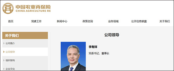 8月14日,觀察者網從中國農業再保險股份有限公司(下稱“中國農再保險”)網站獲悉,李有祥已正式出任該公司黨委書記、董事長,接替原董事長趙陽。