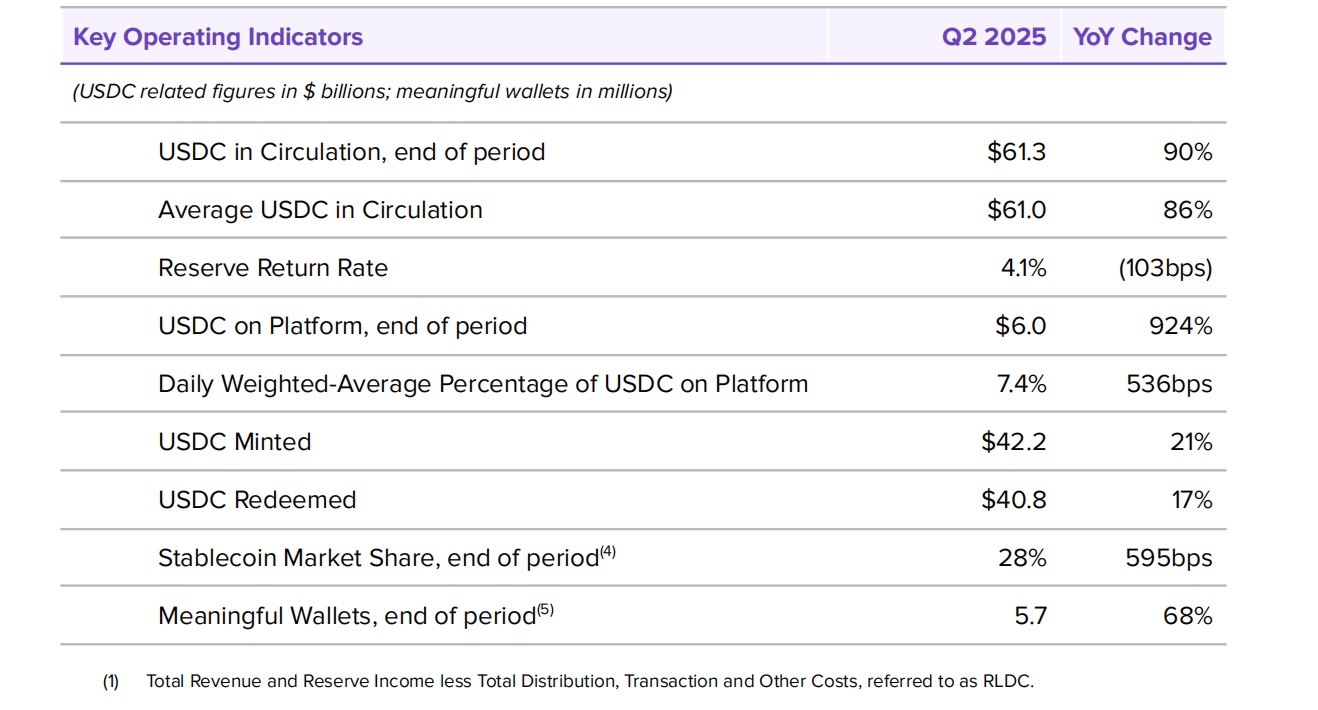 從業務運營層面來看,USDC的擴張成為Circle的最大亮點。截至2025年第二季度末,USDC流通量達613億美元,同比增長90%;截至8月10日,這一數字又增長了6.4%,達到652億美元。與此同時,Circle平台上USDC餘額同比增長924%,穩定幣市場份額提升至28%,同比提升300個基點,進一步鞏固了其行業第二的地位,僅次於Tether。