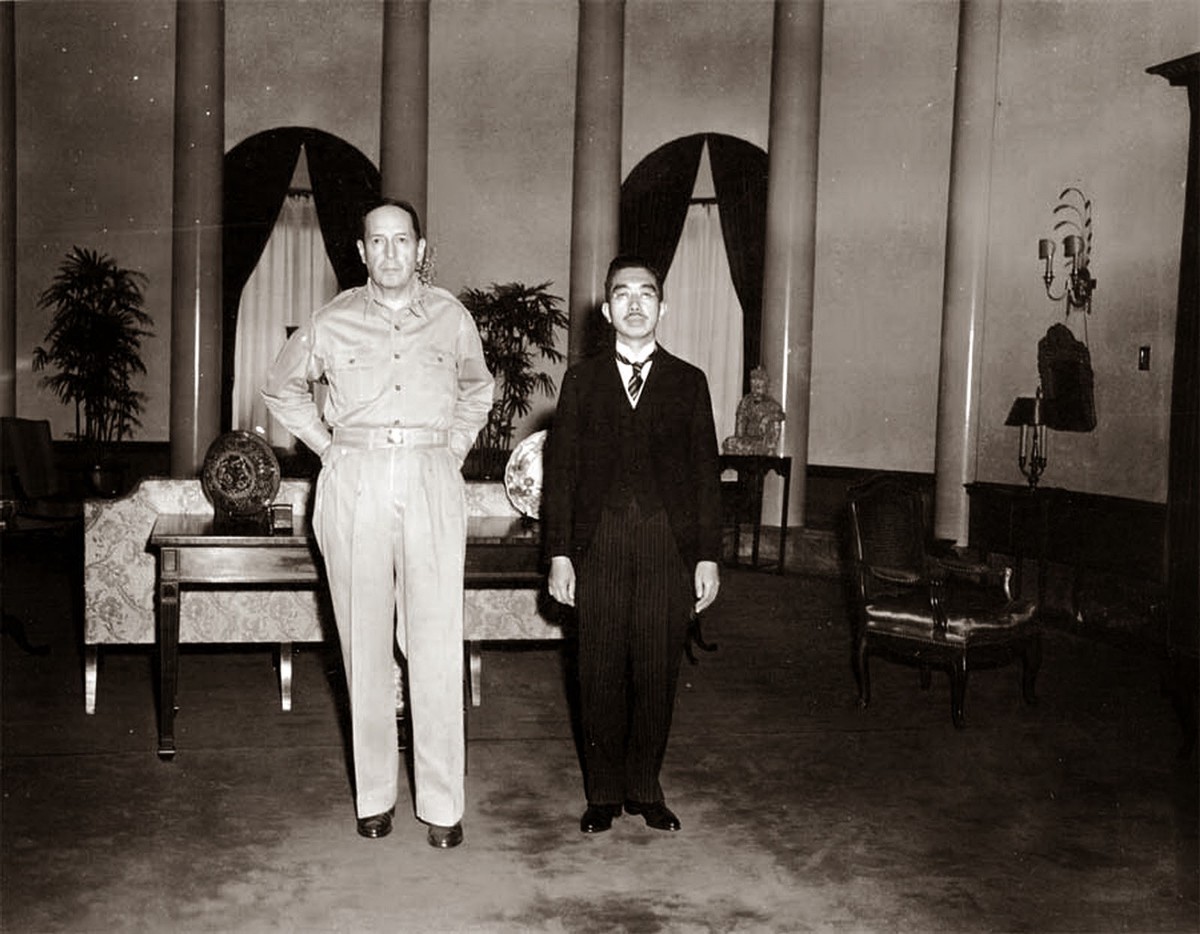 當時對戰爭負有不可推卸責任的裕仁天皇在拜會美國佔領軍總司令麥克阿瑟時,矮小的裕仁在高大魁梧的麥克阿瑟面前顯得非常萎縮,而趾高氣昂的麥克阿瑟則明顯處於居高臨下的地位,這也是當時的日美關係的生動寫照。這張照片曾使日本國民的心理受到極為強烈的衝擊。
