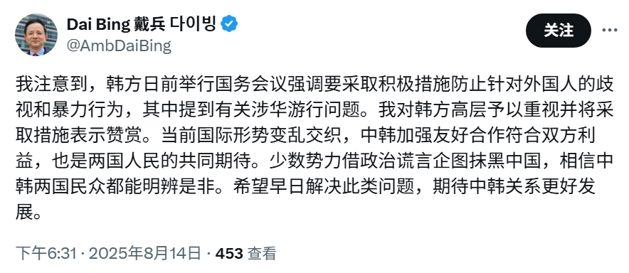 戴兵大使在帖文中説:“我注意到,韓方日前舉行國務會議強調要採取積極措施防止針對外國人的歧視和暴力行為,其中提到有關涉華遊行問題。我對韓方高層予以重視並將採取措施表示讚賞。當前國際形勢變亂交織,中韓加強友好合作符合雙方利益,也是兩國人民的共同期待。少數勢力借政治謊言企圖抹黑中國,相信中韓兩國民眾都能明辨是非。希望早日解決此類問題,期待中韓關係更好發展。”