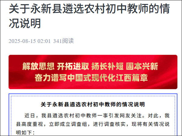據江西省吉安市永新縣“永新融媒”APP消息,8月15日,永新縣聯合調查組發佈關於永新縣遴選農村初中教師的情況説明。