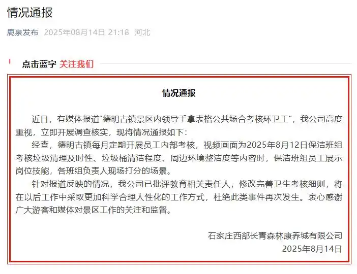 近日,有媒體報道“德明古鎮景區內領導手拿表格公共場合考核環衞工”,我公司高度重視,立即開展調查核實,現將情況通報如下:
