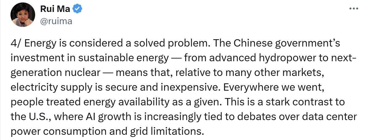 “在中國,這被視為一個已解決的問題,”她在社媒平台X分享見聞時提到,“這與美國形成了鮮明對比。在美國,人工智能的發展,越來越多地與數據中心電力消耗和電網限制的爭論聯繫在一起。”