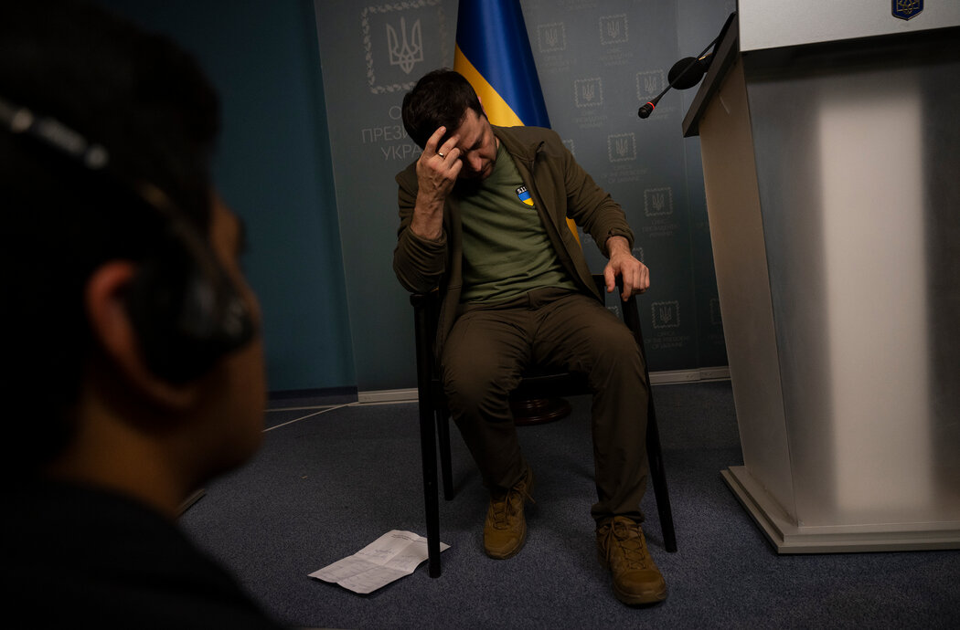 當被問及是否害怕死於戰爭時,澤連斯基説,“如果一個人不害怕失去自己或孩子的生命,那麼這個人就有問題。” 圖源:《紐約時報》