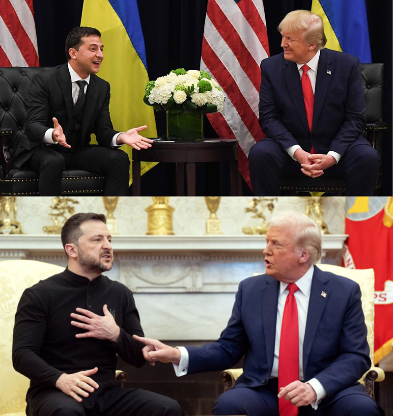 迅速衰老的澤連斯基。上圖為 2019年9月25日首次拜見特朗普,下圖為2025年2月28日相見時爭吵。