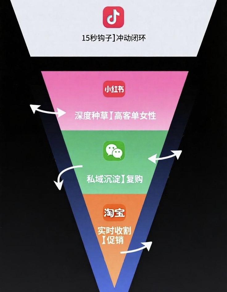 今年5月,貴州大學韓依戀在2.3萬字論文《跨平台內容生產與電商營銷協同機制研究》裏,把抖音、小紅書、微信、淘寶四端拆成了“鈎子—信任—成交—復購”的連續漏斗。
